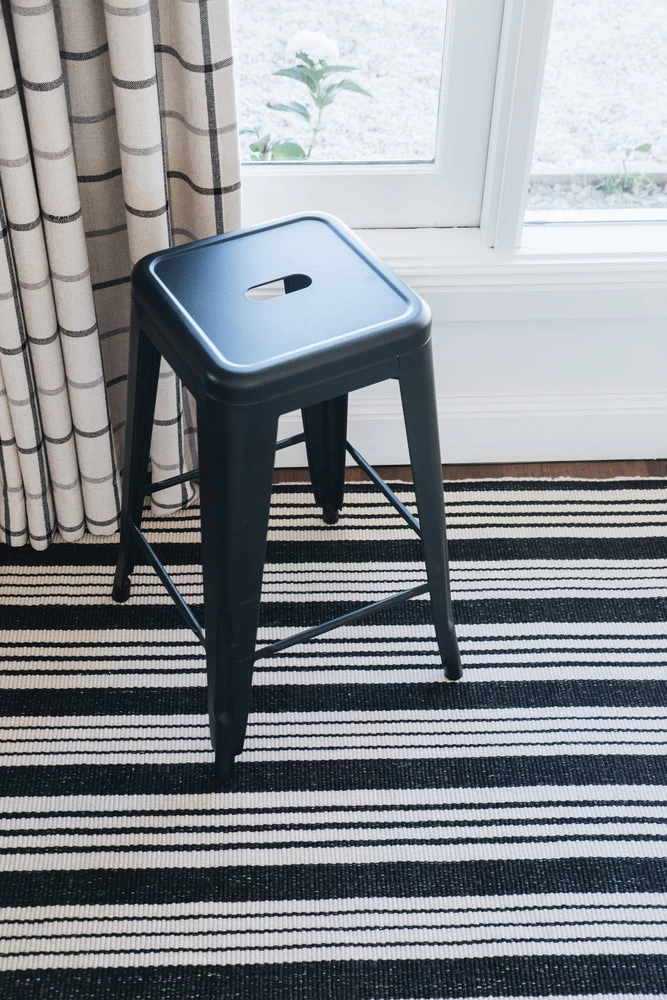 Finish your indoor, terrace or loggia floor with our fashionable all weather rug. Made from super – heroic polypropylene, it is designed to withstand all outdoor conditions. Classic black and ivory stripes translates across modern and traditional decors.