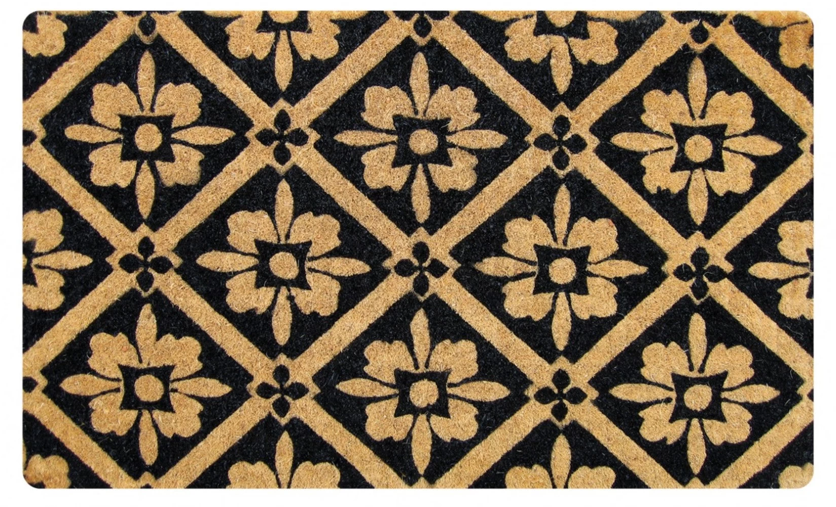 The ideal mat for a sophisticated classic home where black accents in exterior architectural detail are used. Would work well with tessellated tiles and black iron Roman inspired urns.Â