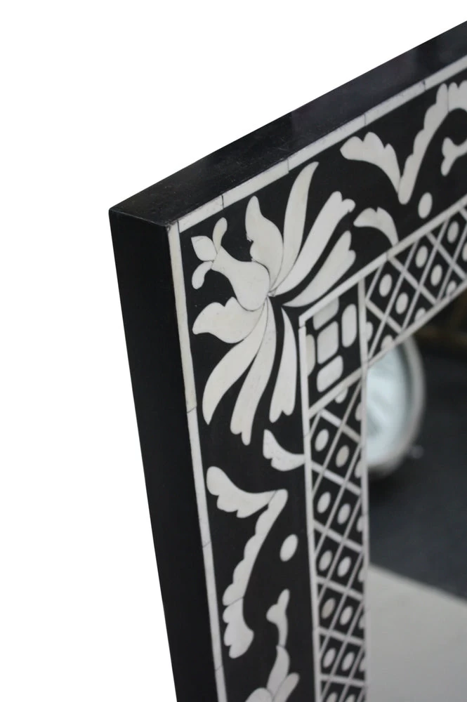 The age-old art of bone inlay is used to create our exquisite mirror, with its sophisticated black and white design providing an exotic sensibility.