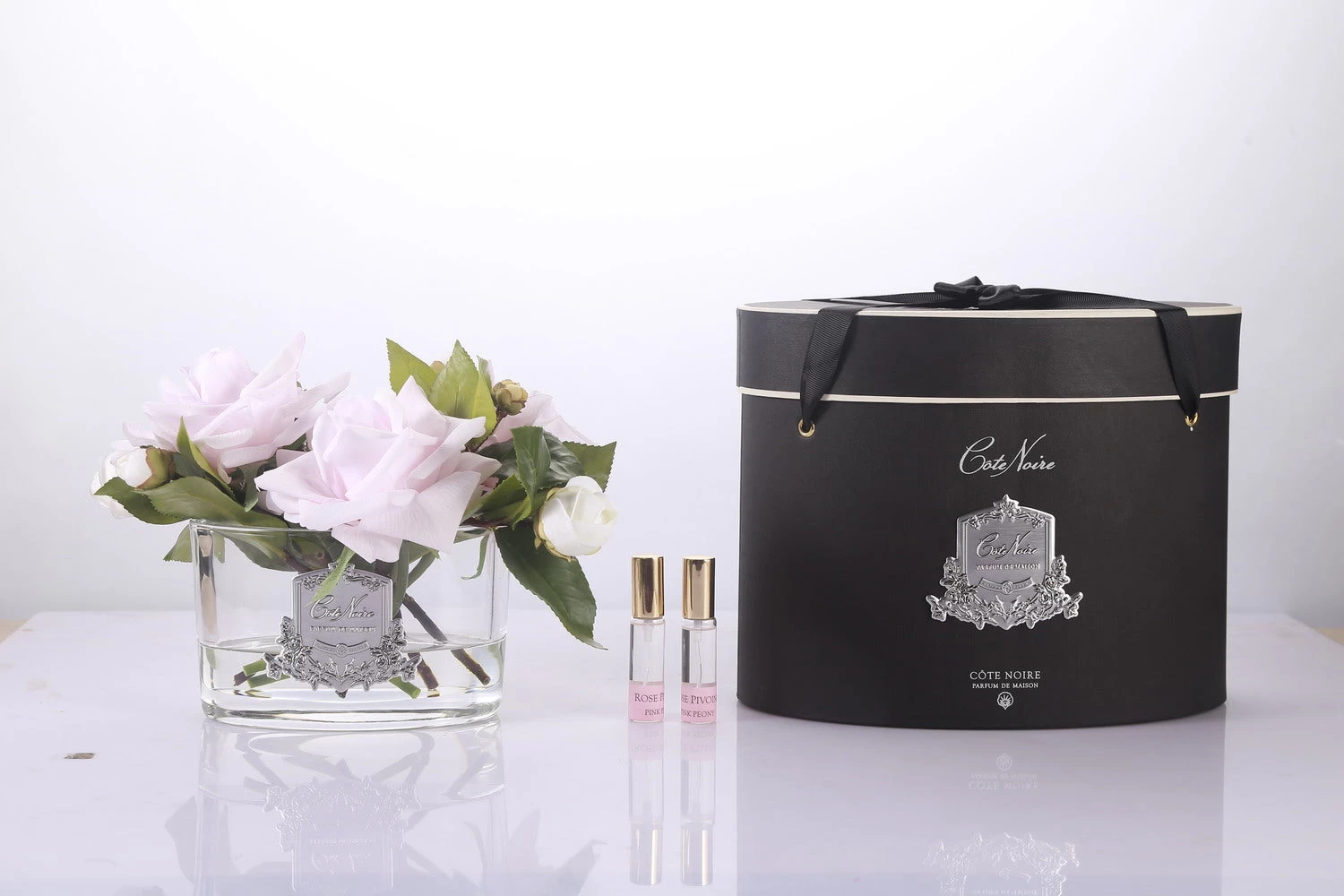 Bring colour and perfume to your room with the beauty of a scented floral arrangement. The Cote Noire Collection features traditional flowers that are natural in touch and appearance. Each arrangement is set into a decorative vase and includes a scented floral spray to refresh and enhance the scent. Gift boxed and ribboned they make the perfect gift.