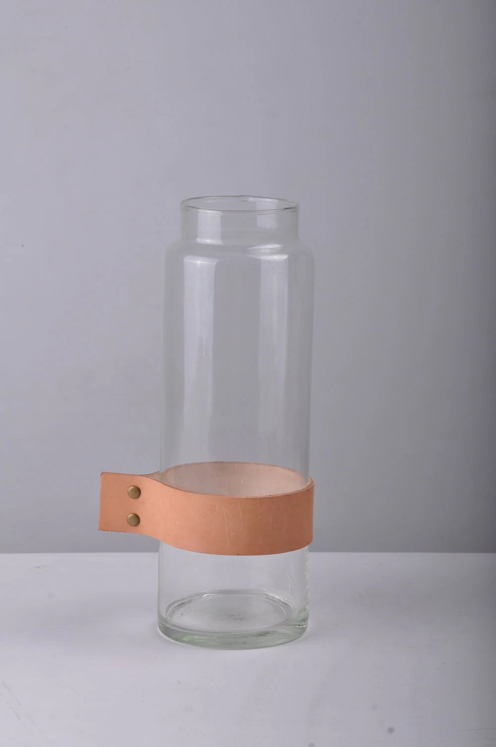 Elementer Tall Clear Glass Vase with brown leather strap. the Elementer collection utilises naturally beautiful elements: wood, marble, leather and glass; to create high functioning pieces that can be displayed and used around the home.