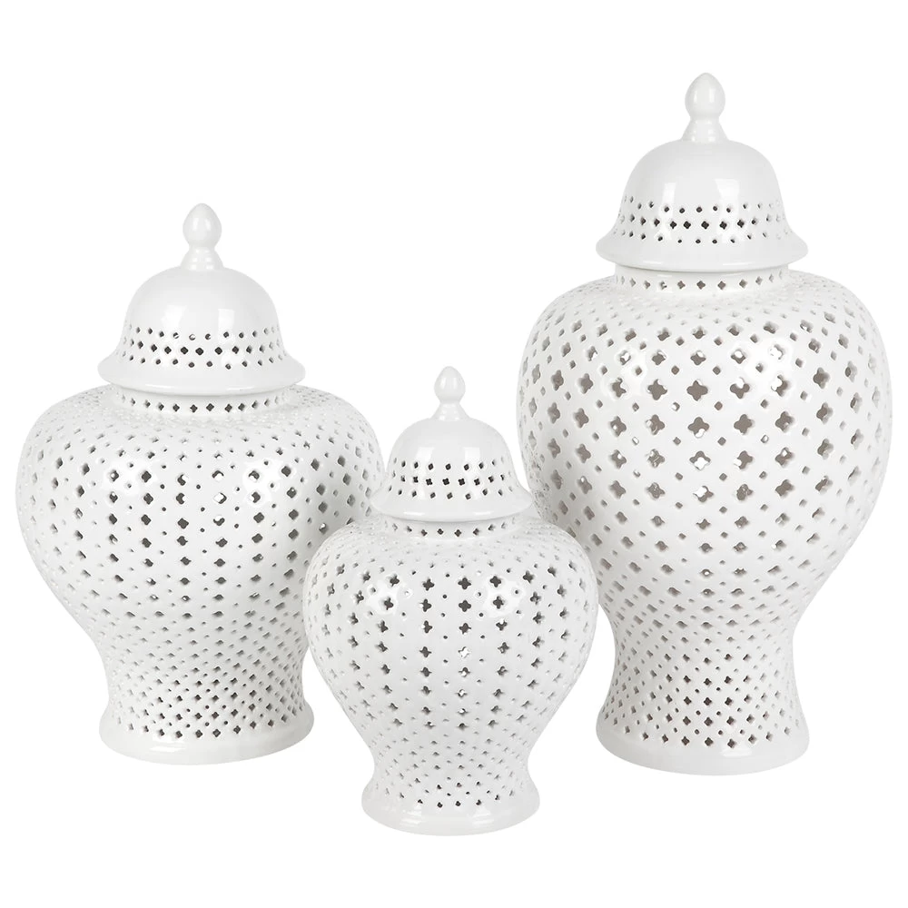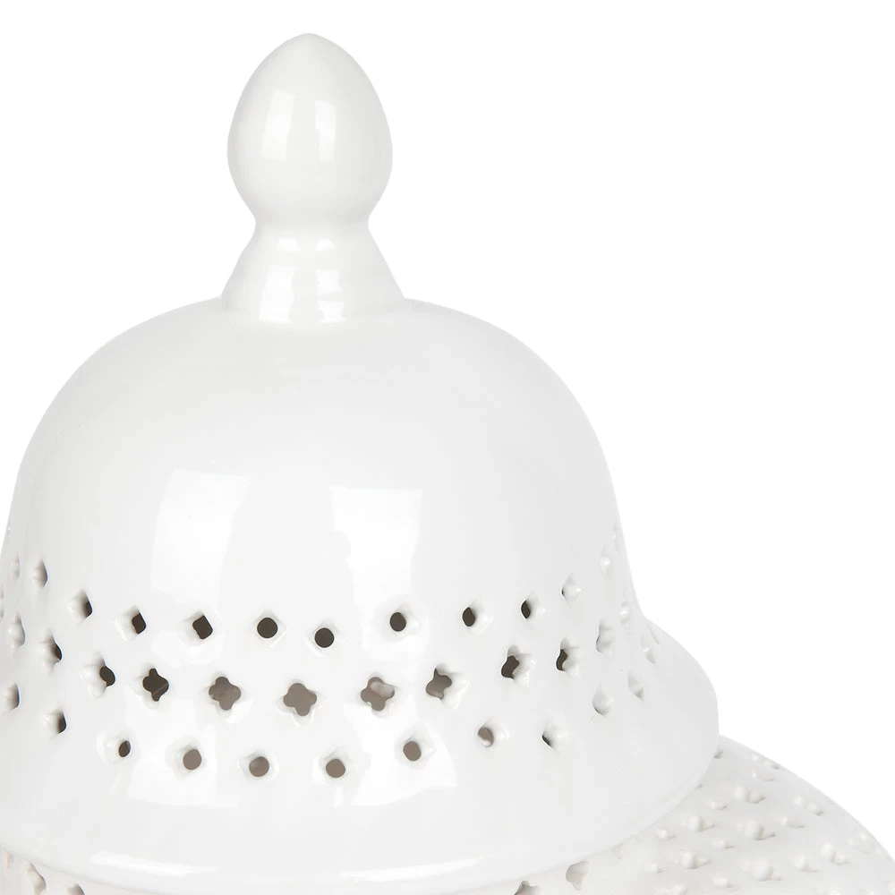Our Minx Temple Jar features an iconic quatrefoil design with a Summer white glaze. Display as a hurricane lamp to throw exquisite patterned shadows. Â