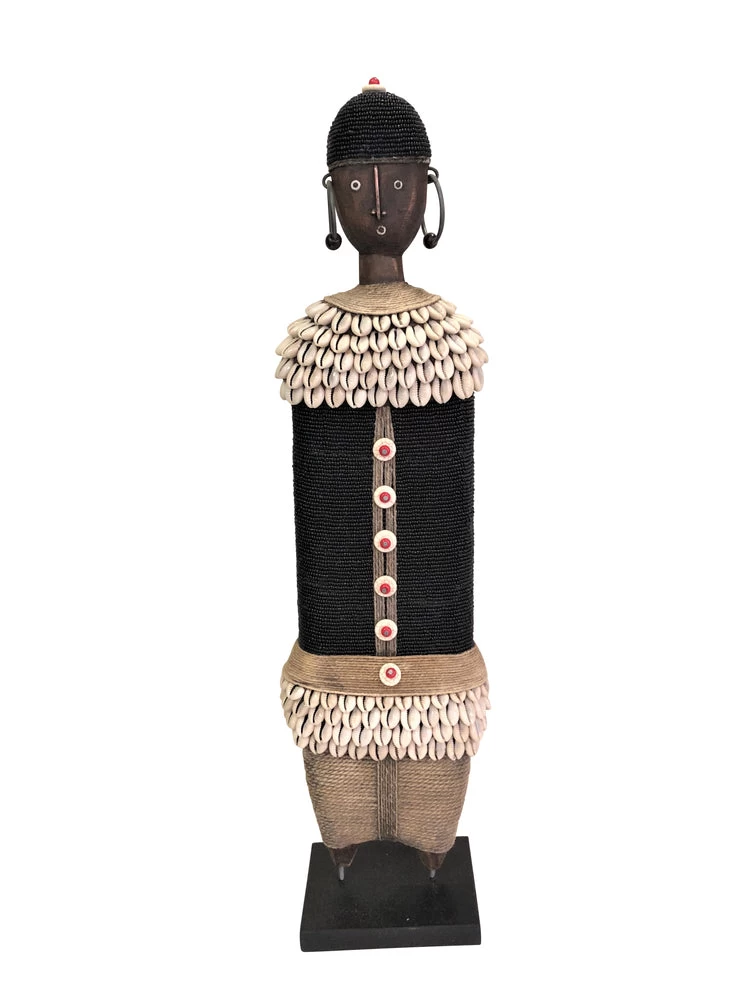 Amongst the Ndamji people of Cameroon, unadorned dolls are made by blacksmiths as playthings for young girls. They are also used to mark houses when the Ndamji are at home. Once a girl reaches puberty, the dolls are beaded and dressed with shells, coins and other trinkets and then become fertility dolls, cared for as though a real child. The dolls are characterised by a narrow trunk and head with a shapely body, forming a striking geometric design. Each doll is unique, as variations will occur in details such as hair, waistbands and earrings. Display with other sizes for visual impact.