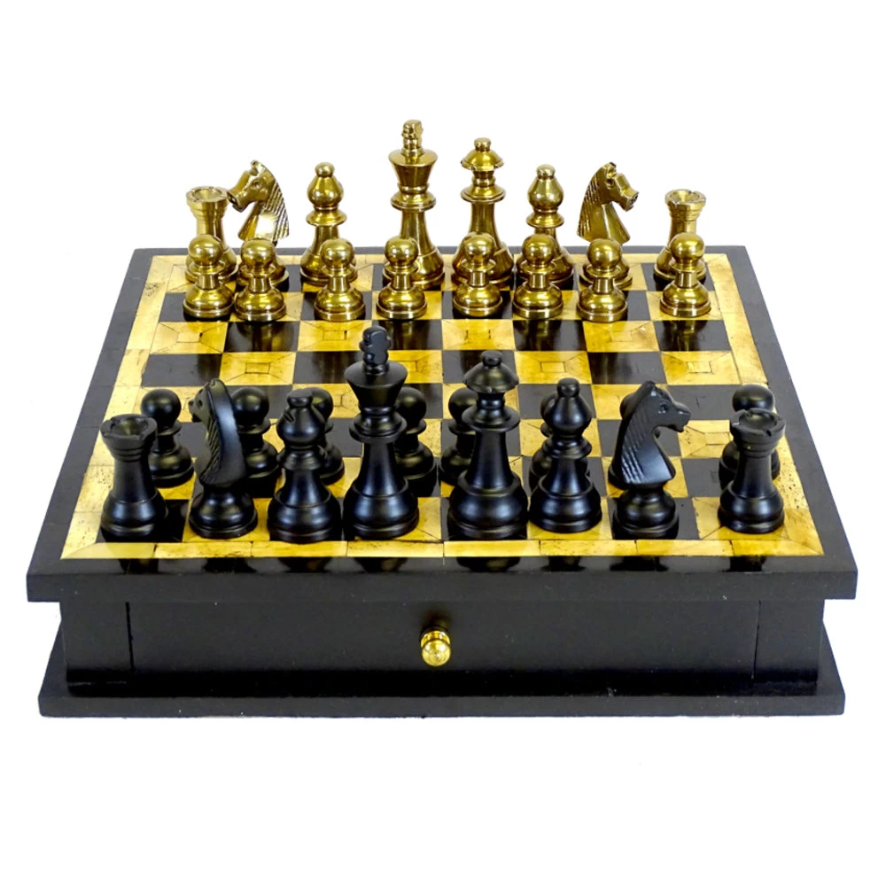 With the resurgence in playing chess impress your opponent with the Sebastian Chess Set. Gold and black pieces can be stored in the magnificent bone inlaid board.