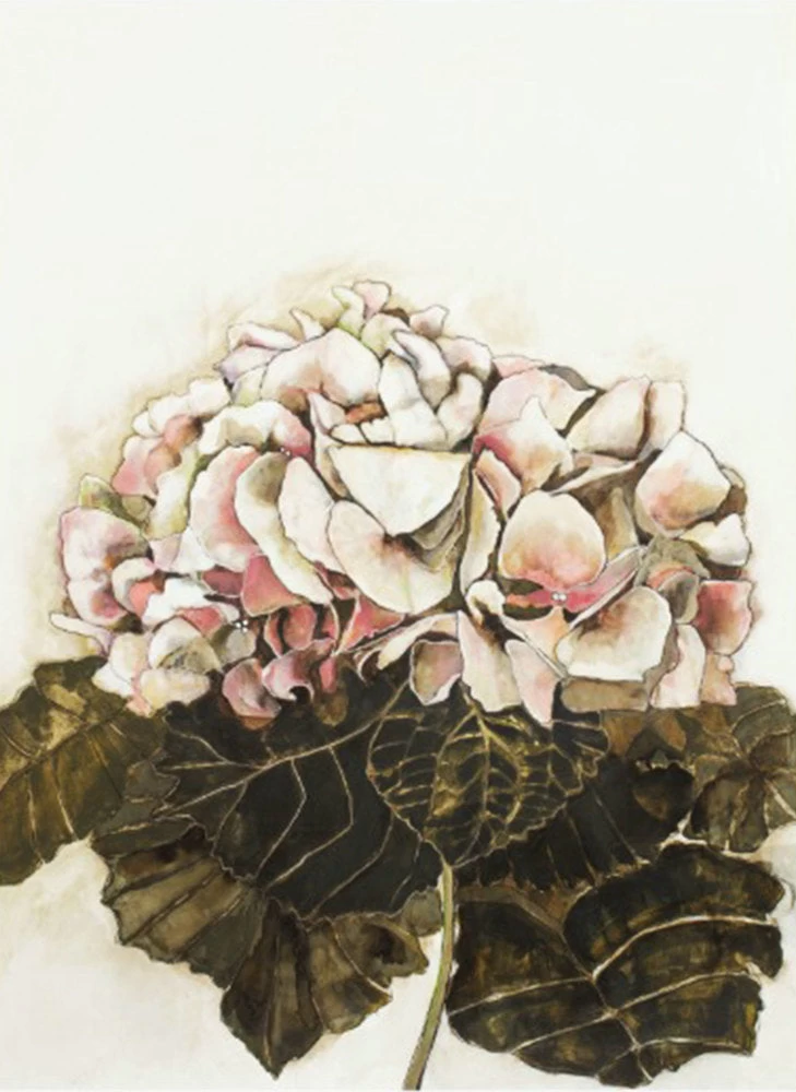 Trained in illustration and painting form an early age, Alissa Wright’s artwork is found in some of Australia’s finest homes and is often featured in interiors style publications. Inspired by her love of flowers and mornings spent as a child with her grandmother in the garden Alissa explores the delicacy and colour contrasts in the petals of the Hydrangea which form a tapestry of their own.