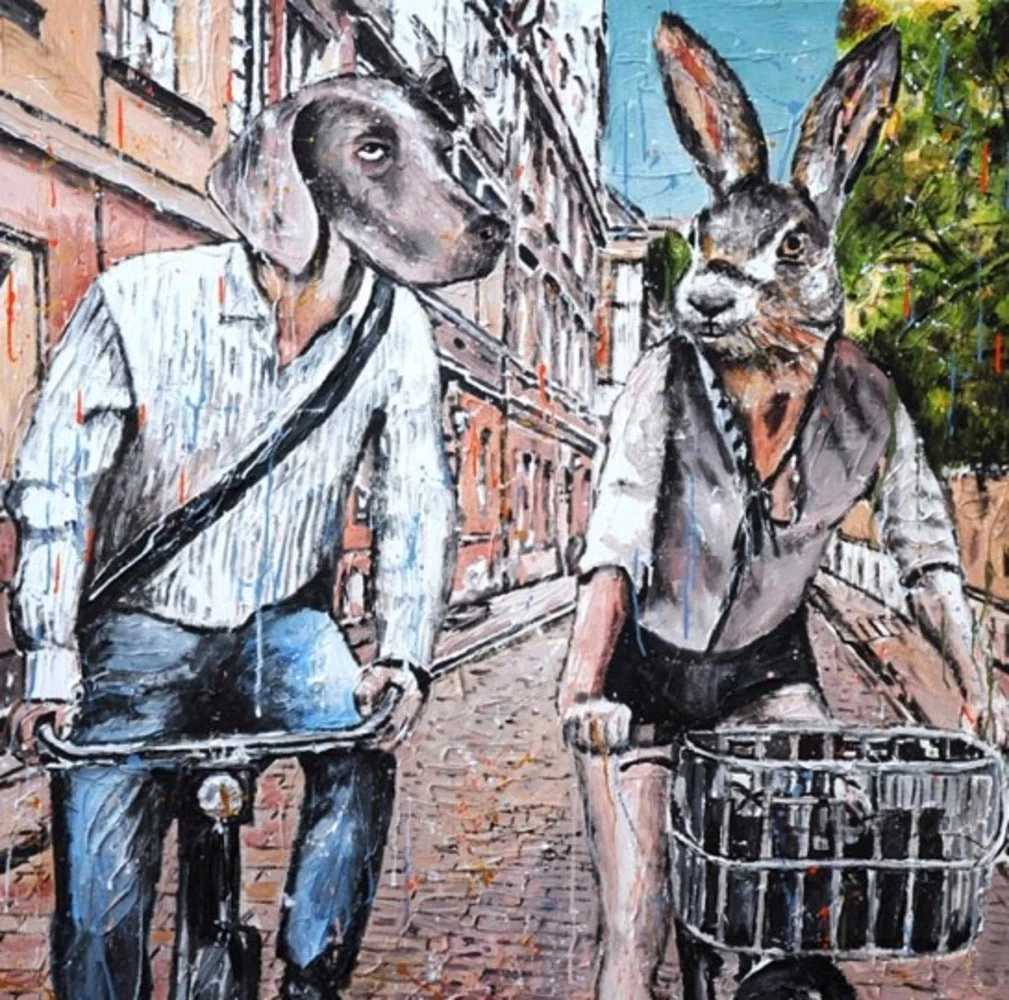 Gillie and Marc are renowned international artists creating large scale public sculptures and paintings that have received worldwide acclaim. Their art explores relationships and love, and finds inspiration in their travels around the world and adventures they have had, or hope to have together. Famous for their iconic characters, featuring animal heads on human bodies such as alter egos Dogman and Rabbitgirl, they hope that their animal hybrids make people think by challenging conventions, expectations and social norms.
