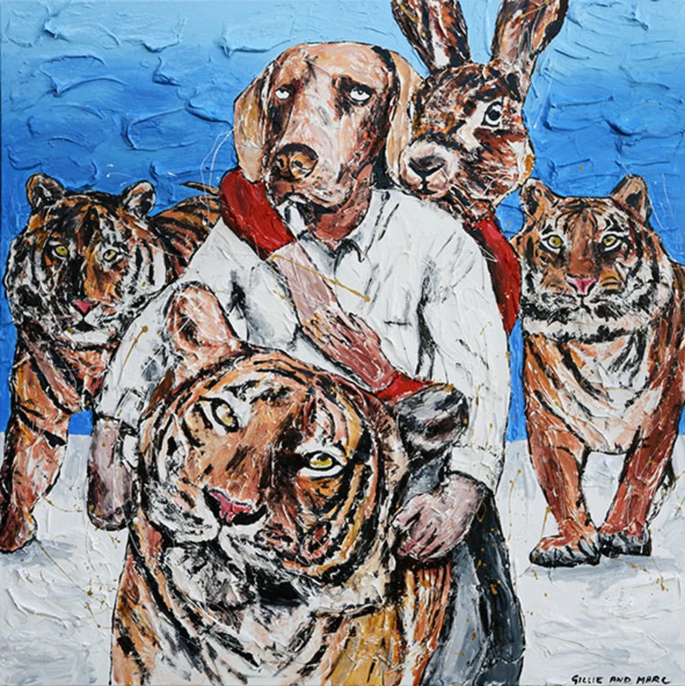 Gillie and Marc are renowned international artists creating large scale public sculptures and paintings that have received worldwide acclaim. Their art explores relationships and love, and finds inspiration in their travels around the world and adventures they have had, or hope to have together. Famous for their iconic characters, featuring animal heads on human bodies such as alter egos Dogman and Rabbitgirl, they hope that their animal hybrids make people think by challenging conventions, expectations and social norms.